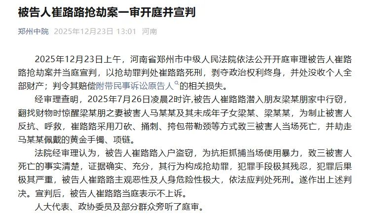 2025年12月23日上午,河南省郑州市中级人民法院依法公开开庭审理被告人崔路路抢劫案并当庭宣判,以抢劫罪判处崔路路死刑,剥夺政治权利终身,并处没收个人全部财产;判令其赔偿附带民事诉讼原告人的相关损失。