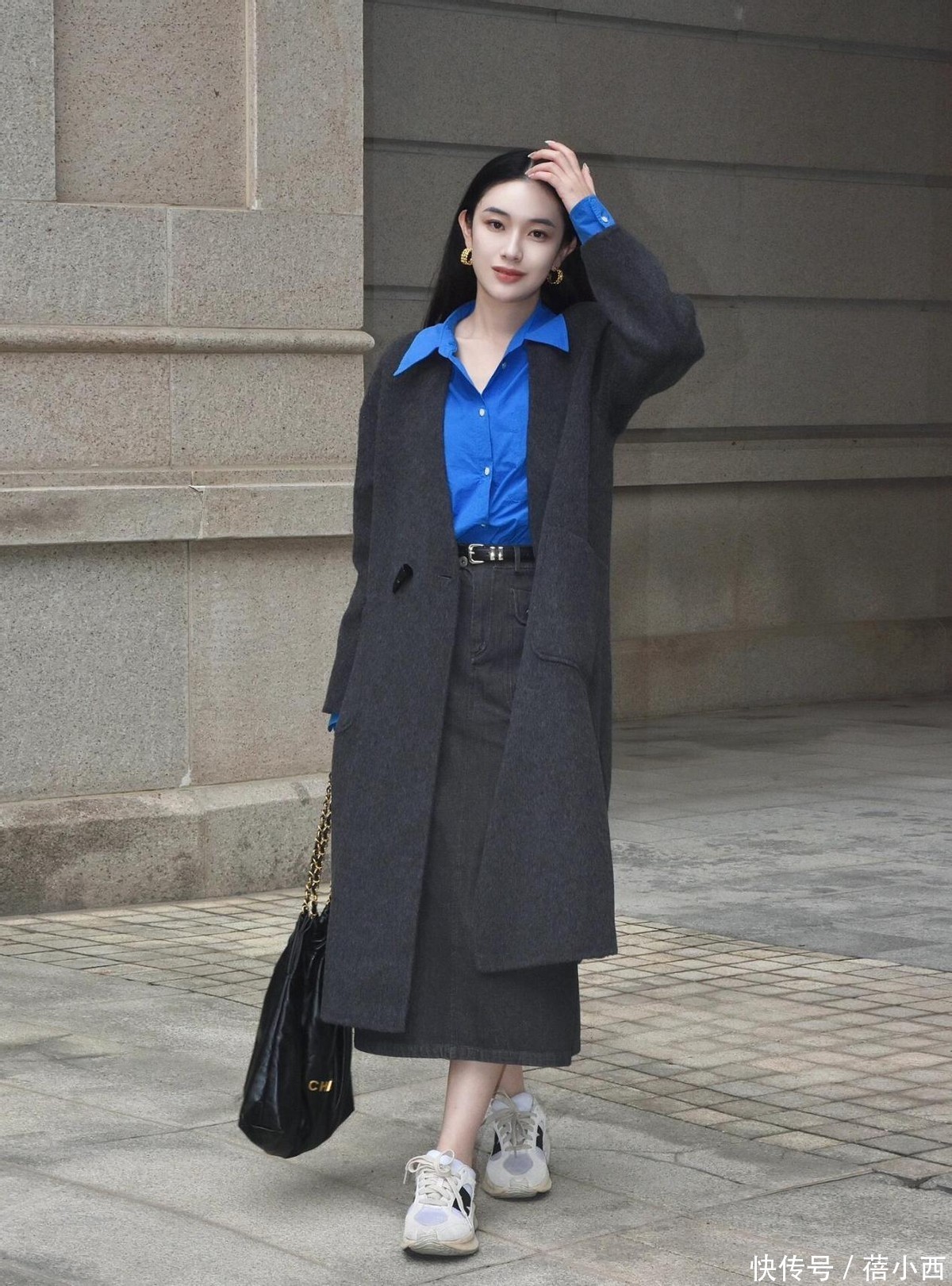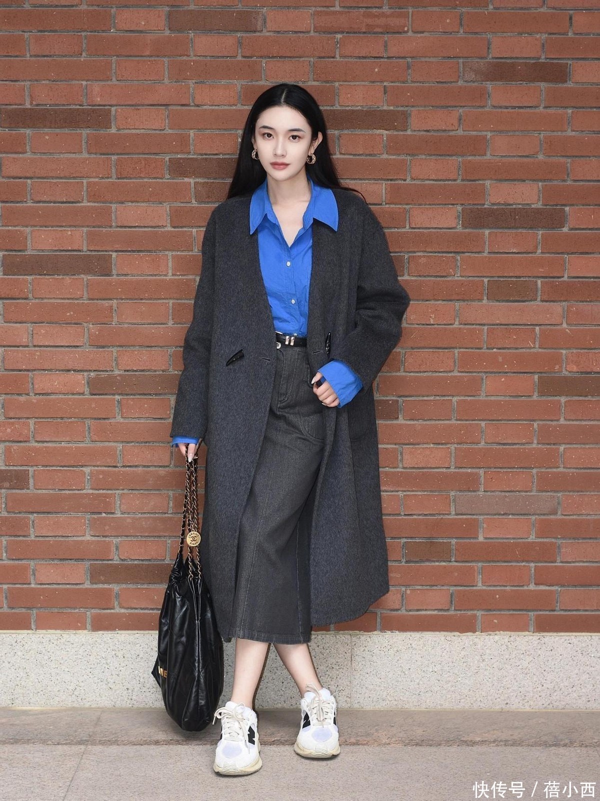 这一身撞色搭配也很值得学习,深灰色大衣叠穿蓝色衬衫,把“随性松弛”和“精致优雅”融为一体,走在街上自带不费力的时髦感。oversize版型的深灰色长款大衣是整个造型的关键,松松垮垮地裹在身上,带着秋冬特有的慵懒氛围,长度盖过臀部却刚好露出裙摆的边缘,不会压个子,又衬得身形格外舒展。