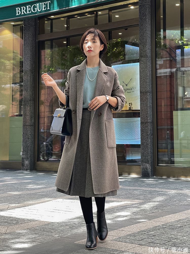 1,过膝灰色大衣搭配毛呢半身裙和短靴