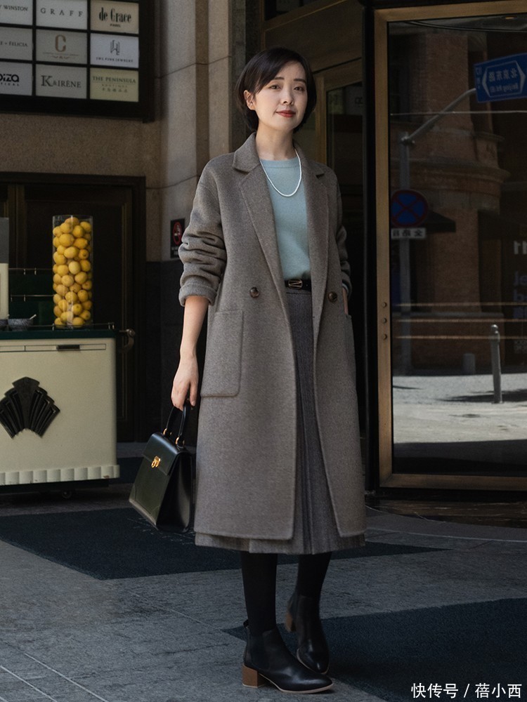 如果是日常上班,选一件长度过膝的灰色大衣,版型不用太宽松,H型或微A型刚好,既能遮住腰腹的小赘肉,又不会显得拖沓。